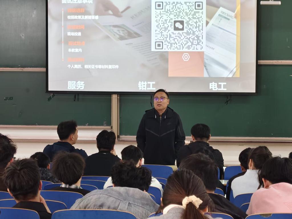为持续拓宽学生就业渠道,精准搭建校企人才对接桥梁,3月28日,机电工程学院于一教101教室成功举办杰瑞敏电集团专场招聘会,参加本次招聘会的有辅导员李亮老师与企业招聘负责人及大四应届生等。