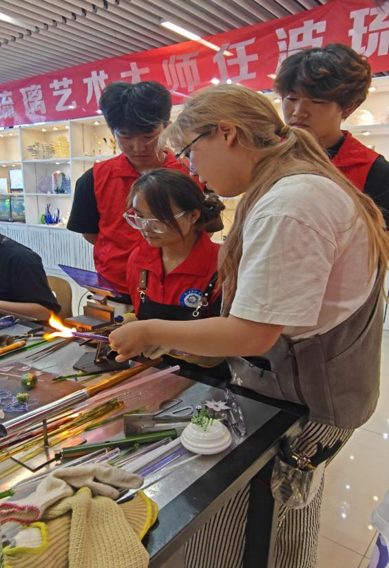 穿好防护用具,志愿者们在工作台前站定。桌上工具与料棒错落摆放,老师的讲解声缓缓响起。大家认真观摩,老师抬手间完成挑料、塑形、吹制的连贯动作,听着关于火候控制、气息调节的叮嘱。短短数分钟的示范,却道尽千年古法的精髓。那些对力度、时机的精准把握,藏着先辈们代代相传的智慧。志愿者们从这浓缩的技艺里,触摸到中国传统工艺独有的浪漫。