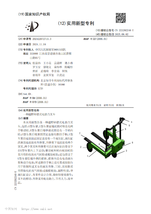 实用新型专利授权:“一种越野轻便式电助力叉车”。