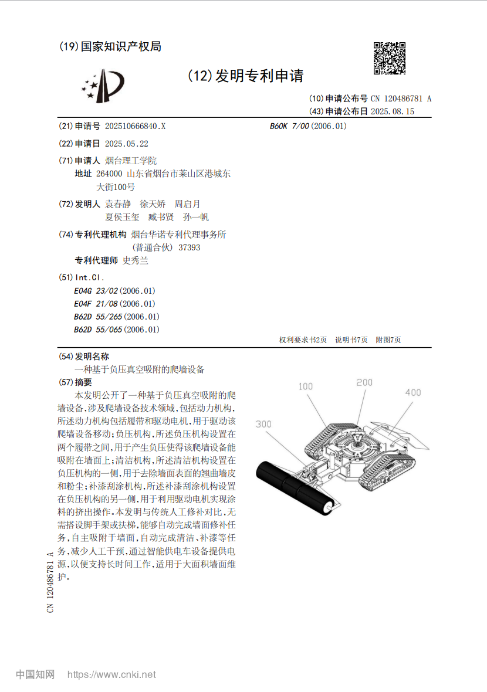 发明专利受理:“萝卜缨一体化智能提取分拣系统”、“一种基于负压真空吸附的爬墙设备”、“一体便捷式机油精准加卸自动化设备”、“一种火箭检测轻便折叠式火箭随动托架”。