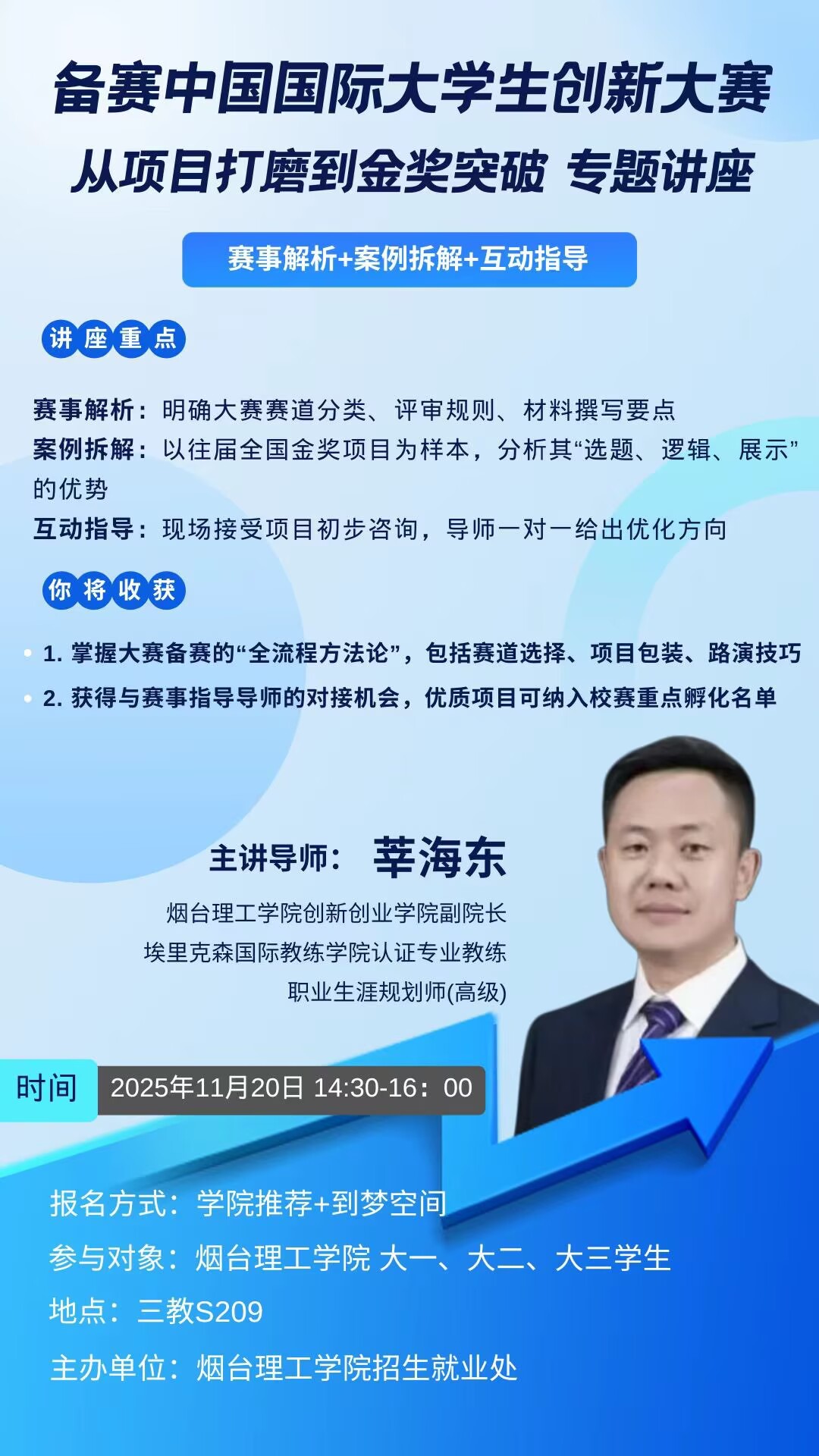 为助力学生在中国国际大学生创新大赛中取得突破,兹定于本周四举办专题讲座,请各学院组织学生参加。
