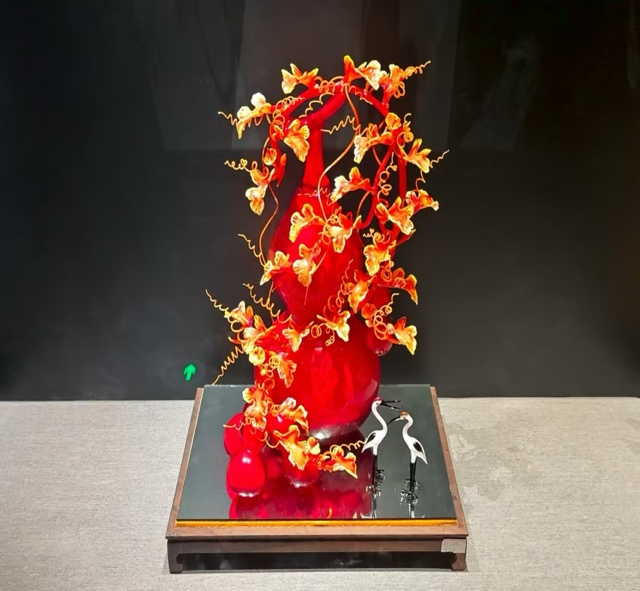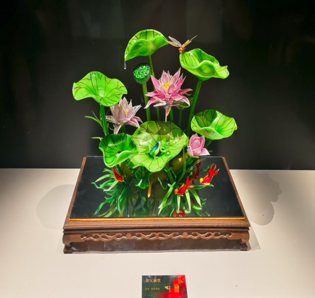 为深入了解琉璃的文化底蕴与工艺奥秘,志愿者们进入了琉璃展区,五彩斑斓、晶莹剔透的琉璃制品令志愿者们赞叹不已。从传统的琉璃珠、琉璃瓶到现代的艺术摆件,琉璃的“流光溢彩”与“巧夺天工”展现得淋漓尽致。