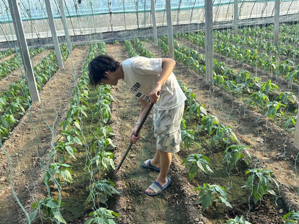 第二天,在村委会协调下,队员们走进蔬菜大棚,向农户学习种植技术。从植株养护到环境调控,队员们边听边学、动手实践,既掌握现代农业种植门道,也深刻体会技术对农业生产的重要性。午后,队员们分散田间,协助采摘作物、清理杂物,在劳作中感悟“粒粒皆辛苦”,坚定服务决心。